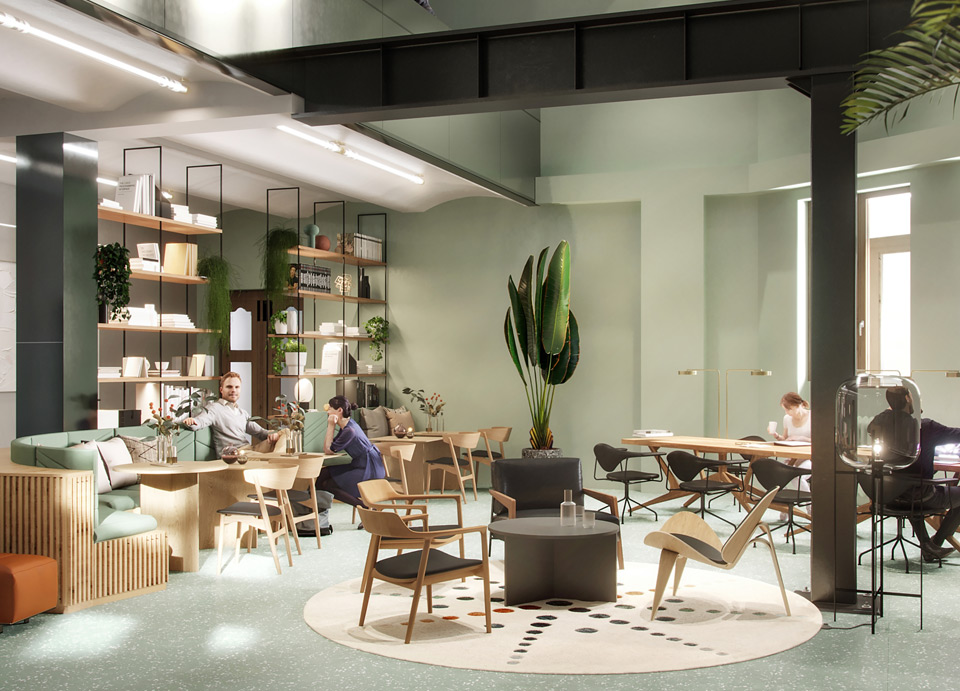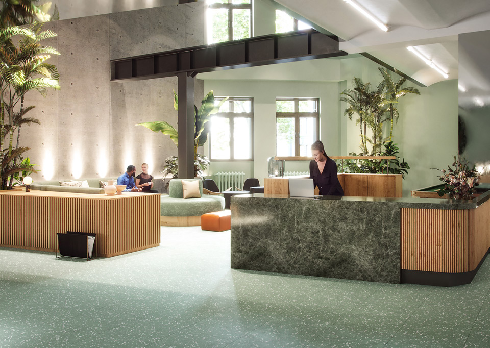 Großzügige Lobby mit Arbeitsplätzen, Loungebereich, Empfang und Spielen im modernen Boutique-Hotel-Style.