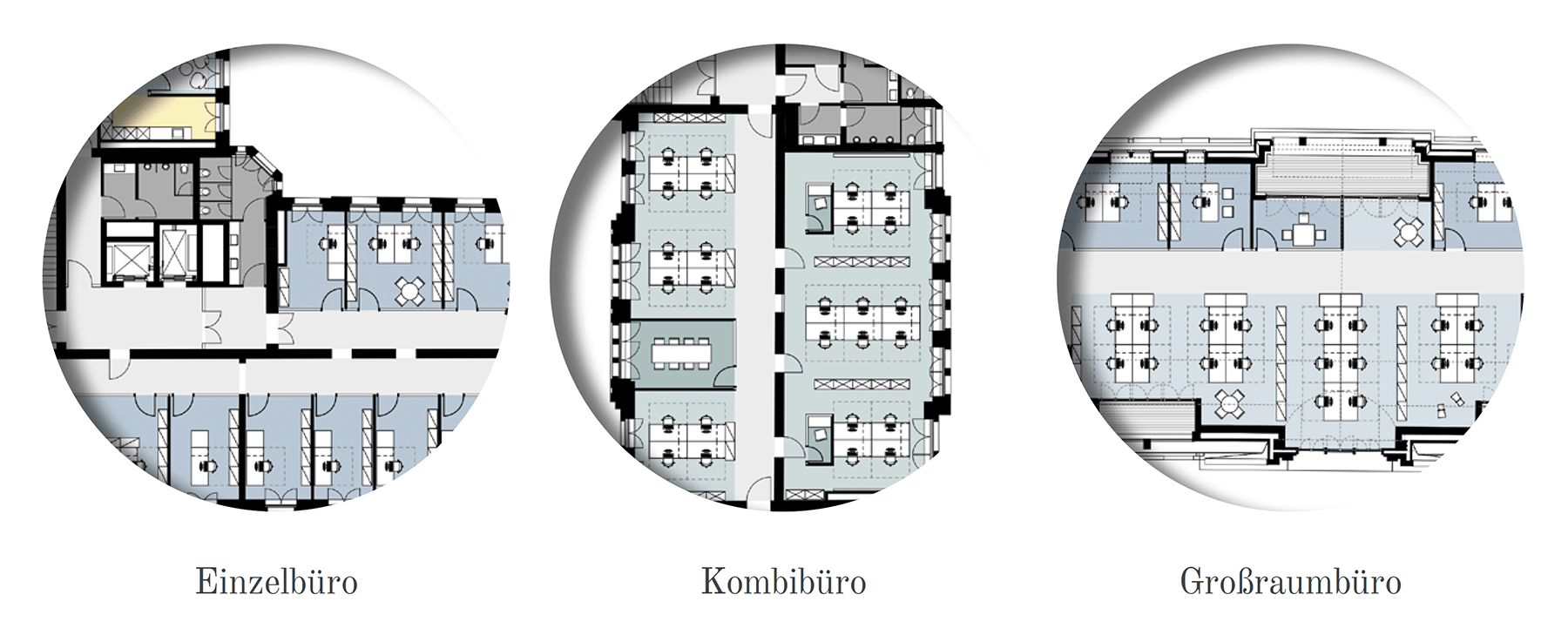 Ob klassisches Einzelbüro oder variable Multi-Space-Lösung: Im Victoria zu Berlin lassen sich die unterschiedlichsten Büro- und Arbeitskonzepte problemlos darstellen und individuell kombinieren.